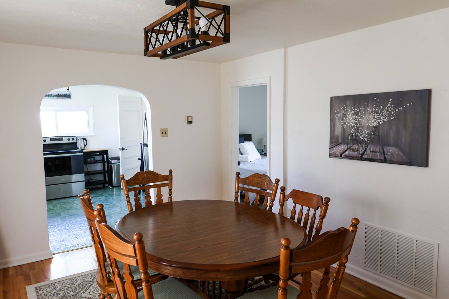 Enjoy modern amenities in this home with great charm and location. You are just two blocks from Main St. and the historic Wolf Hotel. The living room and dining room are prefect for making memories and sharing meals. You will have a great kitchen with brand new appliances and access to a washer and dryer. The three bedrooms give you two queen beds, a full bed, and a pack and play crib. The perfect friend or family spot!