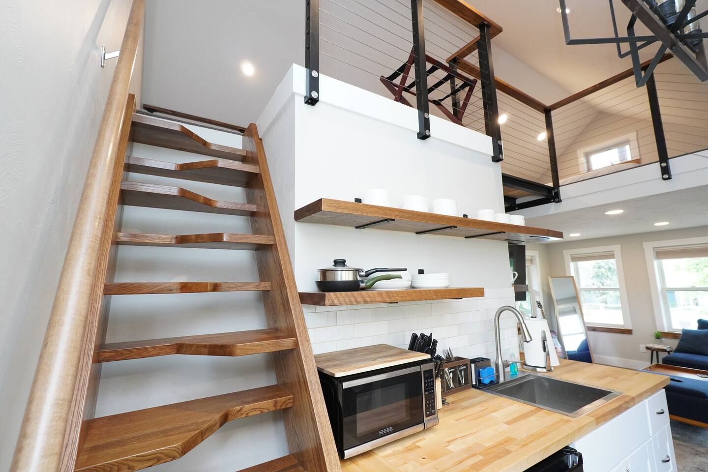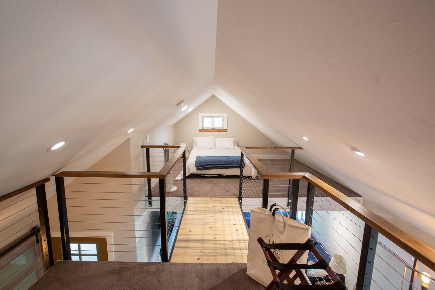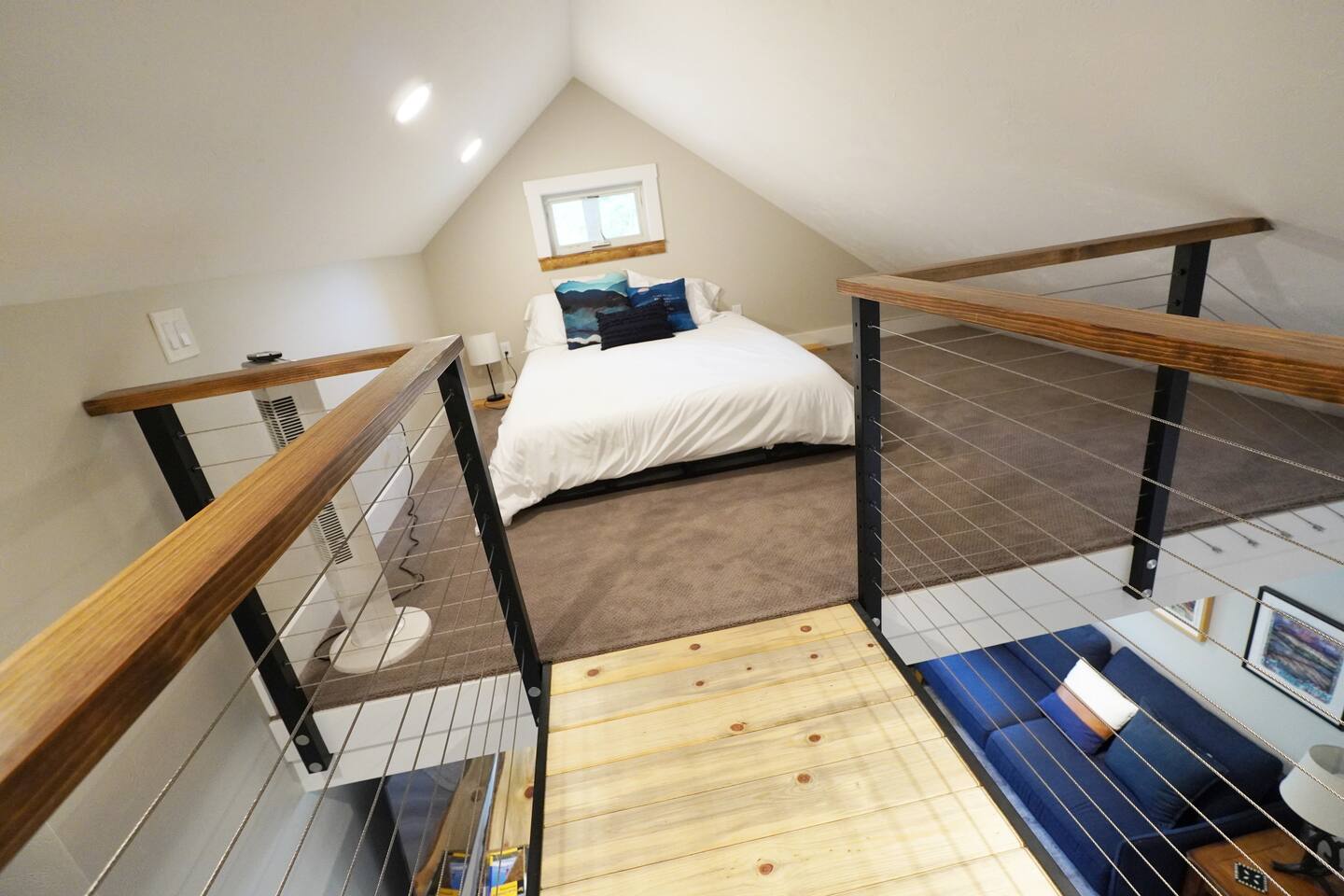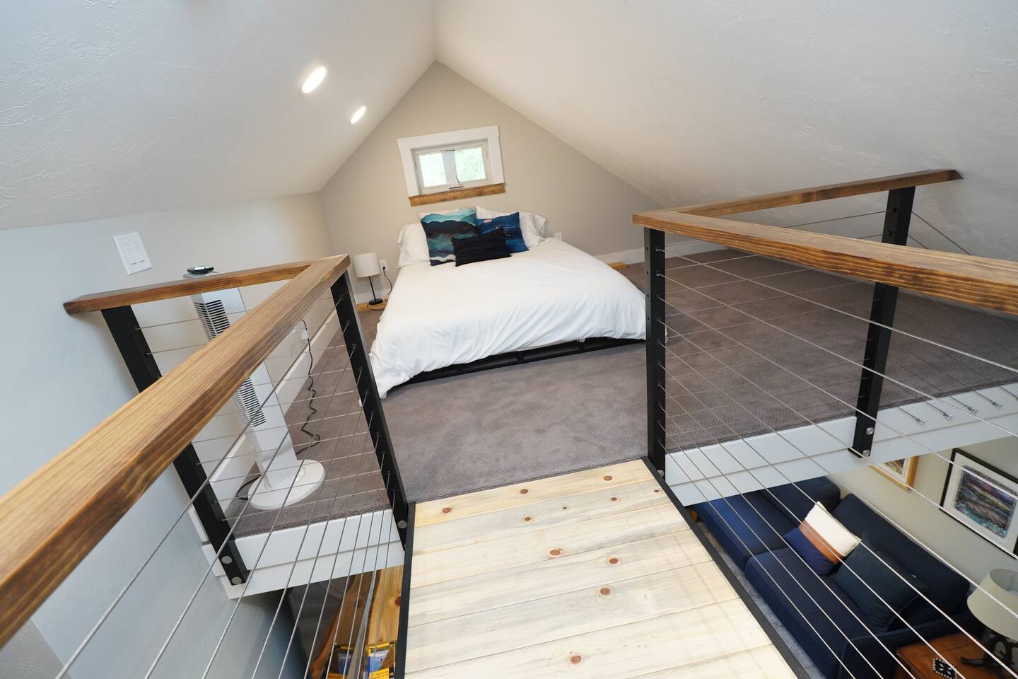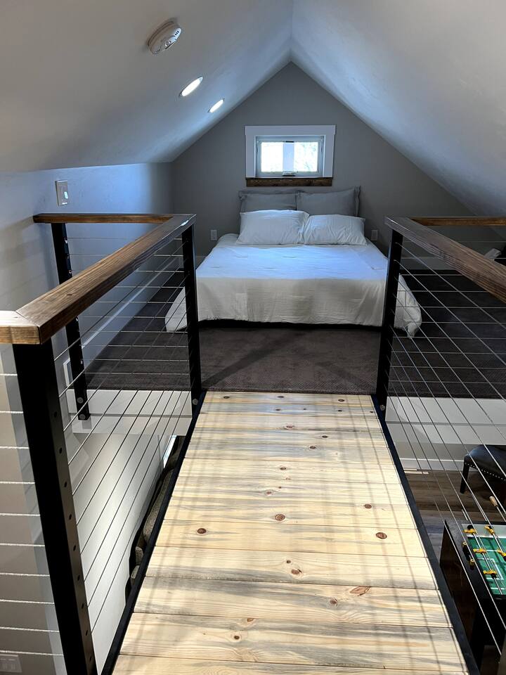 The bed in the loft requires access from a steep ladder and walking across a catwalk, so it is for the adventurous at heart.